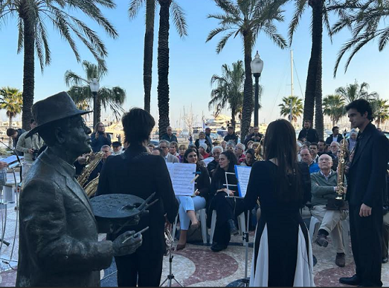 Familiares de Varela y representantes de la cultura local han asistido al acto de reconocimiento que se ha celebrado en la Explanada junto a la estatua del pintor y con el cuarteto de saxofones «Ars Musicandum» del Conservatorio Superior de Música Óscar Esplá interpretando piezas del compositor.