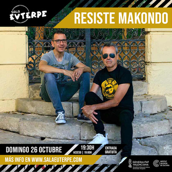 Finalment, el diumenge 26 les 19.30h amb entrada lliure fins a completar aforament es presenta un nou projecte, Resiste Makondo. Aquest és la trobada creativa de Víctor Antón i Vicente García, dos artistes que treballen des de la música com a nucli, però que s’expandeixen cap a la paraula i la imatge. El seu projecte naix de la necessitat de contar històries de manera directa, mesclant cançons amb narrativa i un llenguatge visual inspirat en l’art urbà, i amb un batega motiv que és el de donar sentit i reconéixer La Belleza de la Derrota, en una societat que sembla que només està feta per als triomfadors. Creuen que les històries de vida dels lluitadors són molt interessants, en definitiva, empatitzen amb el “perdedor”, amb el qual se suposa més feble.
