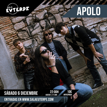 El sábado 6 de diciembre a las 22h es el turno de Apolo, una banda emergente de rock alternativo con tintes de glam, pop y rock and roll, originaria de Catarroja, Valencia. Con una media de edad de apenas 19 años, estos jóvenes músicos han logrado consolidar una propuesta fresca y potente que bebe de influencias tan diversas como The Smiths, David Bowie, Arctic Monkeys, y Los Ronaldos, sin perder nunca su sello personal.
