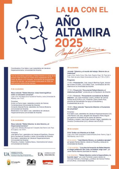 Tras las actividades que la Universidad de Alicante ya desarrolló en la primera mitad de este año, el pistoletazo de salida de lo que será una programación más extensa y prolongada en el tiempo será de marcado cariz académico. “La UA con el Año Altamira” es el título de un ciclo que arrancará este mismo mes de octubre en la sede de la Universidad en Alicante”, que acogerá hasta tres jornadas (los días 28 de octubre, 17 de noviembre y 2 de diciembre), con interesantes charlas de profesores y doctores en Filosofía y Letras, Historia, Ciencias Políticas y Sociología, coordinados por la catedrática de Literatura Hispanoamericana Eva Valero, integrada en el equipo de trabajo creado por el alcalde Juanjo Berenguer y la concejalía de Cultura de El Campello, que dirige Dorian Gomis.