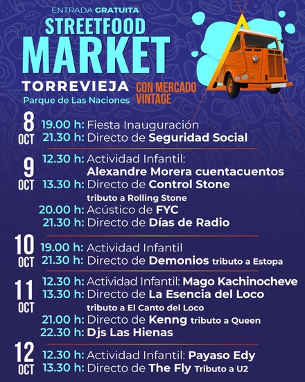 El Street Food Market s’inaugurarà el pròxim dimecres, 8 d’octubre, a les 19.00 hores, amb la Festa d’Inauguració, a la qual seguirà l’esperat concert del mític grup valencià Seguretat Social, a les 21.30 hores.