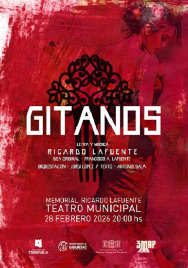 “Gitanos” se representará en el Teatro Municipal el próximo sábado, 28 de febrero, a las 20:00 horas, dentro del Memorial Ricardo Lafuente, organizado de manera bianual por el Patronato Municipal de Habaneras. En el marco de este memorial, la Asociación Musical 3 MAP será la encargada de llevar a escena esta emblemática obra, estilo zarzuela con sabor torrevejense, recuperando así una pieza fundamental del patrimonio musical de Torrevieja.