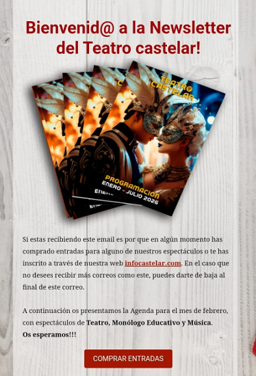 A partir de ese momento, los suscriptores recibirán en su correo electrónico todas las novedades relacionadas con el Teatro Castelar, con recordatorios de los espectáculos que cada mes se ofrecerán en su escenario. Además de los horarios, precios y datos de la obra y de la compañía, también se incluye un enlace para ver un vídeo con un breve resumen de la obra en cuestión.