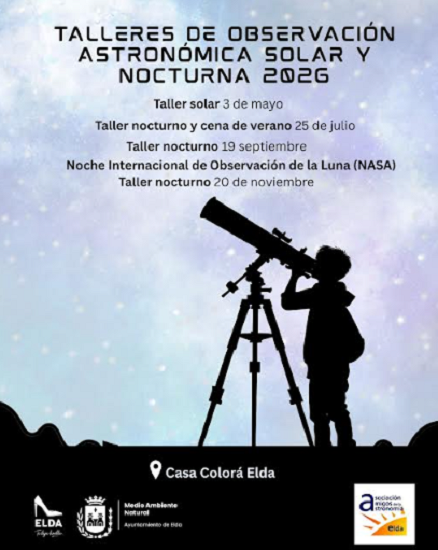 El Ayuntamiento de Elda, a través de la Concejalía de Medio Ambiente, y en colaboración con la Asociación de Amigos de la Astronomía, pone en marcha un nuevo ciclo de talleres de observación astronómica solar y nocturna que se desarrollarán a lo largo de 2026 en la Casa Colorá. La iniciativa tiene como objetivo acercar la ciencia y el conocimiento del cielo a la ciudadanía de una forma accesible, didáctica y participativa.