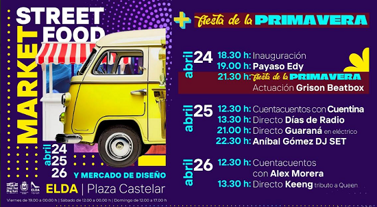 La Plaza Castelar acogerá del 24 al 26 de abril una nueva edición del Elda Street Food Market, un evento organizado por el Ayuntamiento de Elda a través de la Concejalía de Turismo que, por segundo año consecutivo, se celebrará de manera conjunta con la Fiesta de la Primavera, que en esta ocasión contará con la actuación de Grison Beatbox, junto con la presencia de Aníbal Gómez, Guaraná y Días de Radio.