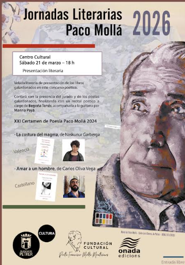 El próximo sábado 21 de marzo, a las 18:00 horas, en el Centro Cultural de Petrer, tendrá lugar la presentación pública de los poemarios ganadores del XXI Certamen de Poesía Paco Mollá 2024, un acto que contará con la presencia de los dos autores ganadores.