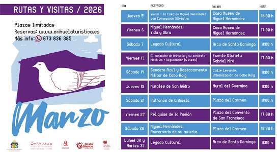 Con esta agenda, Orihuela refuerza su apuesta por la difusión de su patrimonio histórico, cultural y natural, ofreciendo tanto a residentes como a visitantes una variada oferta de experiencias durante todo el mes de marzo.