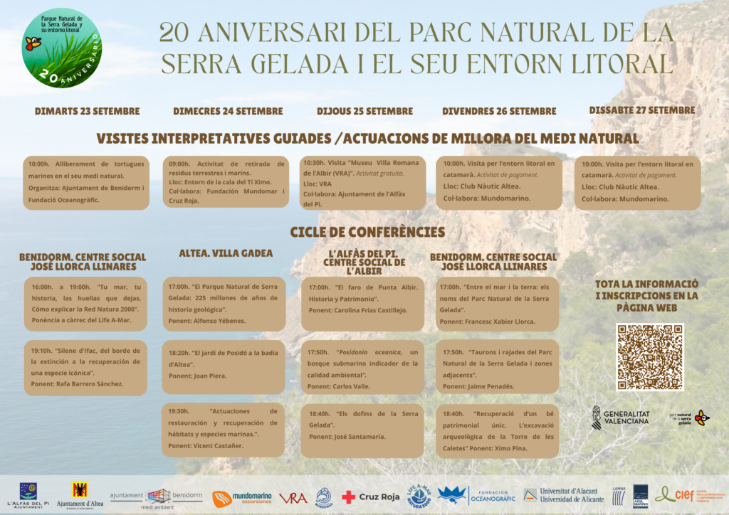 El acto ha concluido con el anuncio del programa de actos que desde el Parc Natural de la Serra Gelada están preparando con motivo de su vigésimo aniversario. Esta programación especial tendrá lugar del 24 al 27 de septiembre y contará con un ciclo de conferencias en las que se hablará de la posidonia oceánica, la historia ecológica, la etnología, la avifauna, la fauna marina y la flora. También se han previsto una serie de visitas interpretativas, en el medio marino y terrestre. Por último, se organizará una suelta de fauna en colaboración con centros de recuperación y el Oceanogràfic.