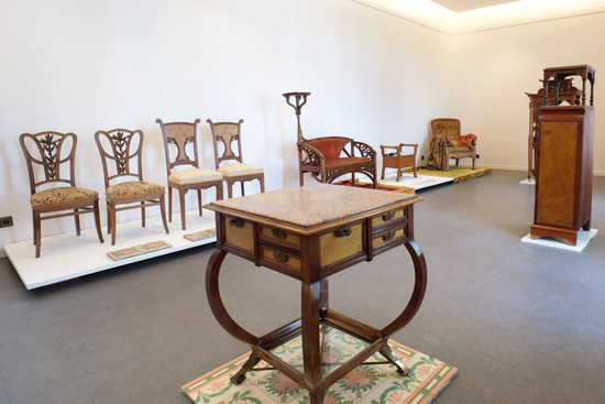 Las piezas expuestas abarcan un amplio abanico de estilos y materiales madera de nogal, mármol, terciopelo, plata, cristal o encaje de bolillos, reflejo del refinamiento y el gusto cosmopolita de la familia Navarro a finales del siglo XIX y principios del XX. La muestra ofrece así un recorrido íntimo por la estética doméstica del Art Nouveau y por la personalidad de una mujer que encarna el espíritu emprendedor, culto y sofisticado de su época.