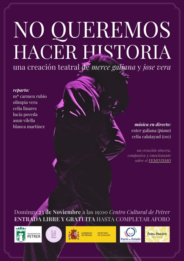 Como parte de las actividades programadas en torno al 25N, la concejalía de Igualdad y Servicios Sociales ha presentado este lunes la obra de teatro “No queremos hacer historia”, una creación de El Bar de Abajo Producciones que regresa a Petrer por segundo año consecutivo tras la excelente acogida del público en 2024. La representación tendrá lugar el domingo 23 de noviembre a las 19:00 horas en el Centro Cultural, con entrada libre y gratuita hasta completar aforo.