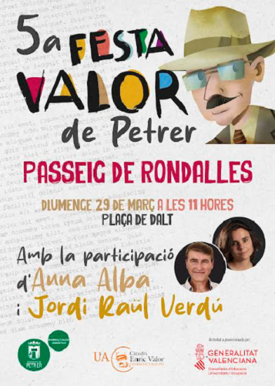 El próximo domingo 29 de marzo, a las 11 horas, la Concejalía de Normalización Lingüística ha organizado la V Fiesta Valor “Paseo de Rondalles” en honor del escritor de Castalla Enric Valor, por su gran vinculación con la ciudad de Petrer. En esta quinta edición participarán los cuentacuentos Anna Alba i Jordi Raül Verdú, que serán los encargadas de amenizar la ruta literaria que discurrirá por el barrio antiguo.