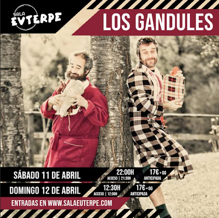 El sábado 11 a las 22h y el domingo 12 a las 12:30h, tienes una doble cita con Los Gandules y sus seudoversiones. Los Gandules continúan girando su chou. Pertrechados con su habitual indumentaria de gala (bata y zapatillas de andar por casa) y dos guitarras para dar el pego, perpetran un espectáculo notablemente superior a los fuegos artificiales con los que recibieron a Marco Polo en China. Sus seudoversiones musicales y los inapropiados comentarios desatan sentimientos y emociones existencialistas entre el público que se muestra incrédulo a la par que convencido. Si todavía no sabes si venir a verlos busca en youtube las actuaciones mejor pixelizadas. Temas como ”La Nasa”, “Cuídame el Gato”, “Políespan”, “Ladrón de Cobre” y muchas más, componen este único y exclusivo trabajo con el que llevan girando este año por toda la geografía española.